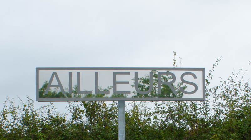Réalisé avec de l’acier inoxydable, sablé à l’endroit des lettres et poli miroir entre celles-ci, le panneau se découvre à la vitesse de notre déplacement de marcheur. L’inscription, l’effet miroir et l’effet cinétique renvoient et mettent en relation le lieu réel, celui de notre réalité présente et un espace fictionnel, celui de l’Ailleurs.