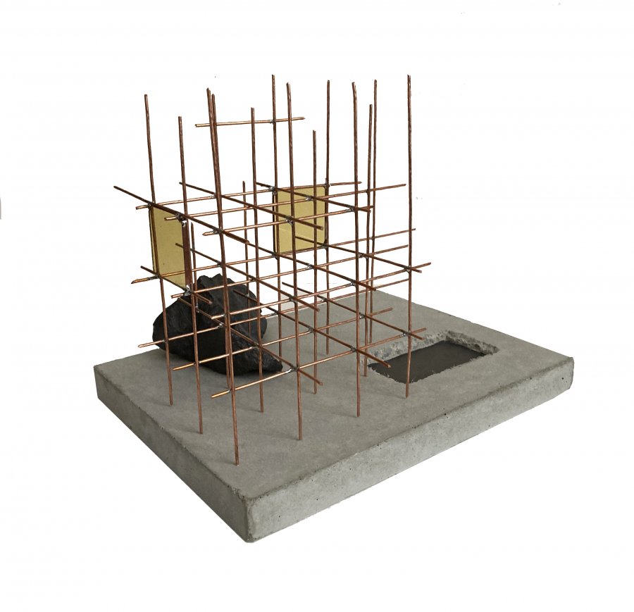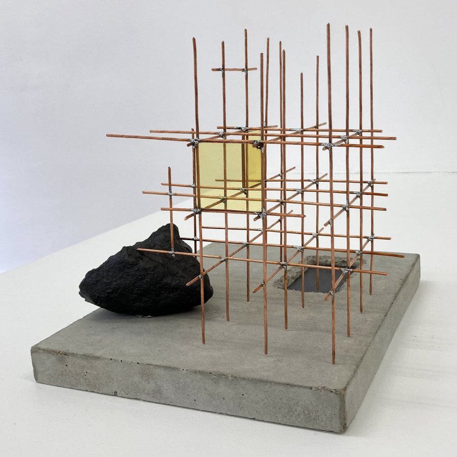 Combinatoire 2, 2022, 33 × 25 × 25 cm, béton, cuivre, verre jaune d’argent, pierre, graphite ©Bernard Calet