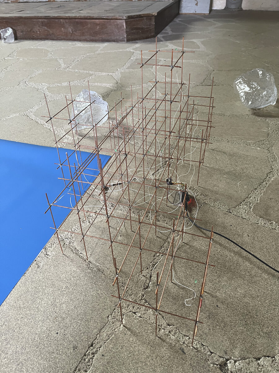 Arborescence (Être ici/là-bas), 2024, structure en cuivre, LEDs vertes connectées à un programmateur relié à un micro, pierres de verre (verre soufflé), ©Bernard Calet