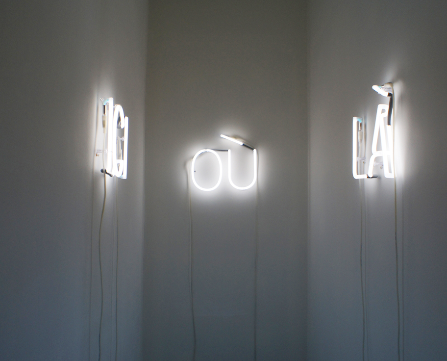 Quatre lettres assemblées : O.N.E.T formant un espace fermé dans lequel le spectateur peut pénétrer, PVC blanc satiné et PVC diffusant, tube fluorescent, 265 x 240 x 240 cm ©Bernard Calet