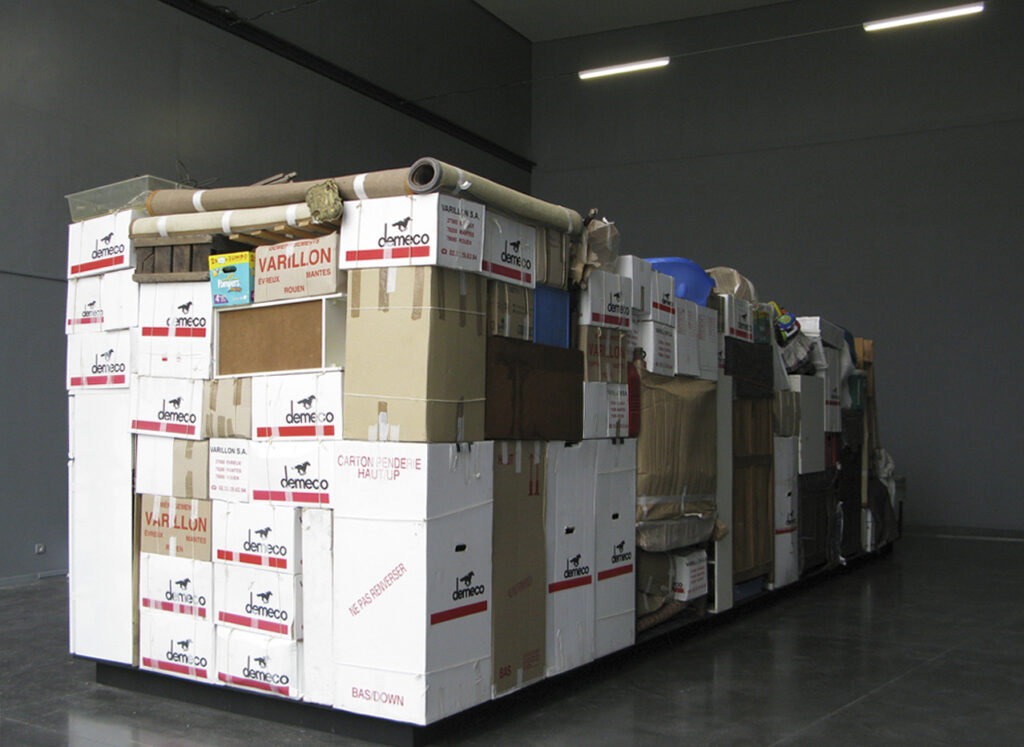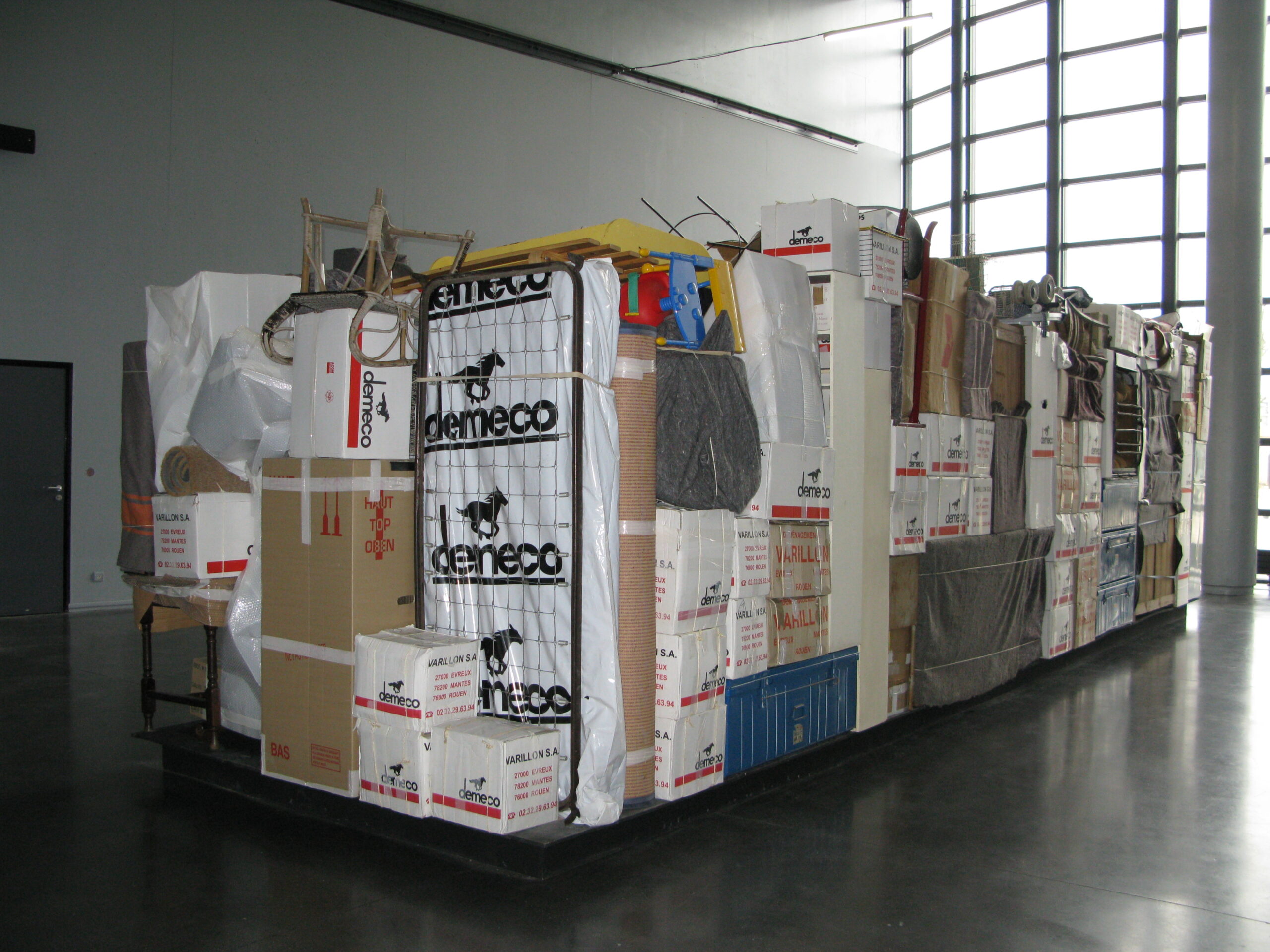 Dé/ménage/ment, 2009, différents cartons et affaires d’un vrai déménagement, 230 x 240 x 1000 cm