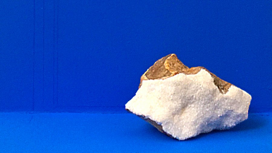 Feuille d’aluminium pliée, peinture bleu incrustation (peinture utilisée dans les studios de cinéma ou vidéo), dessin avec la feuille carbone bleu, caillou recouvert en parti de peinture réfléchissante (peinture blanche avec des micros billes)