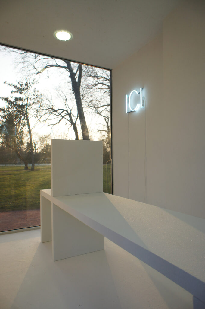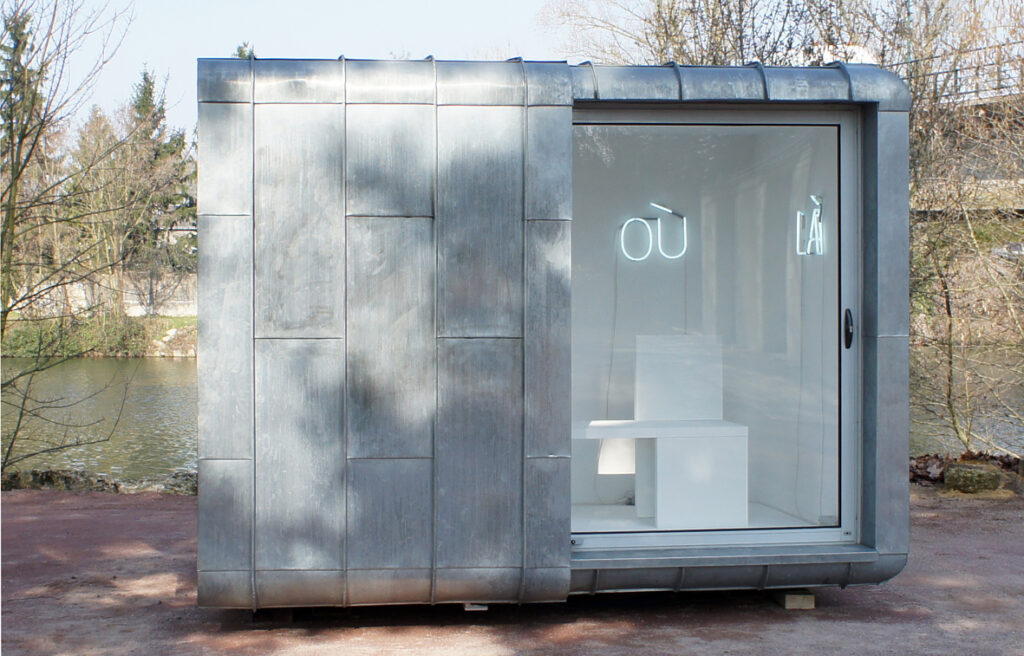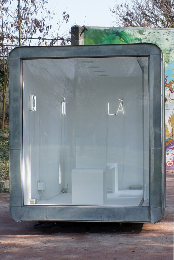La Borne est une micro architecture fermée, qui est déplacée dans différents espaces urbains, des ICI. Lieu d’exposition temporaire visible uniquement de l’extérieur, le spectateur est tenu à distance par deux vitres, il n’entre pas.