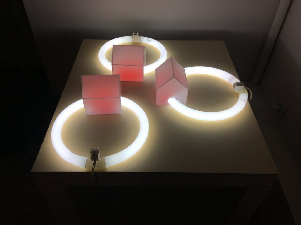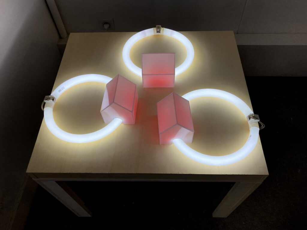 Lotissement, 2017Galerie-Métropolis, ParisLotissement, 2017 , Plexiglas diffusant, tubes fluorescents circulaires, gélatine rouge, bois 10 × 68 × 75 cm ©Bernard CaletLotissement, 2017 ©Bernard CaletLotissement, 2017 ©Bernard Calet