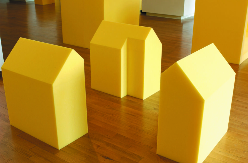 Movie Land, 2003 (détail), Blocs de mousse de polyuréthane semi-rigide jaune, 5 vidéos sur support mural (images : travellings de zones d’activité commerciale, bande son : phrases comportant un adverbe de lieu prisent dans des téléfilms) ©Bernard Calet