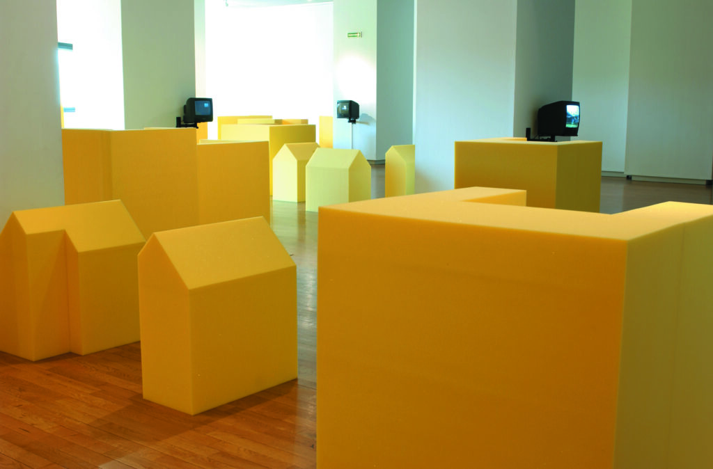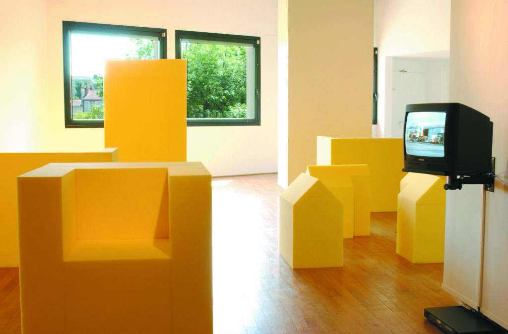 Movie Land, 2003 (détail), Blocs de mousse de polyuréthane semi-rigide jaune, 5 vidéos sur support mural (images : travellings de zones d’activité commerciale, bande son :phrases comportant un adverbe de lieu prisent dans des téléfilms) ©Bernard Calet