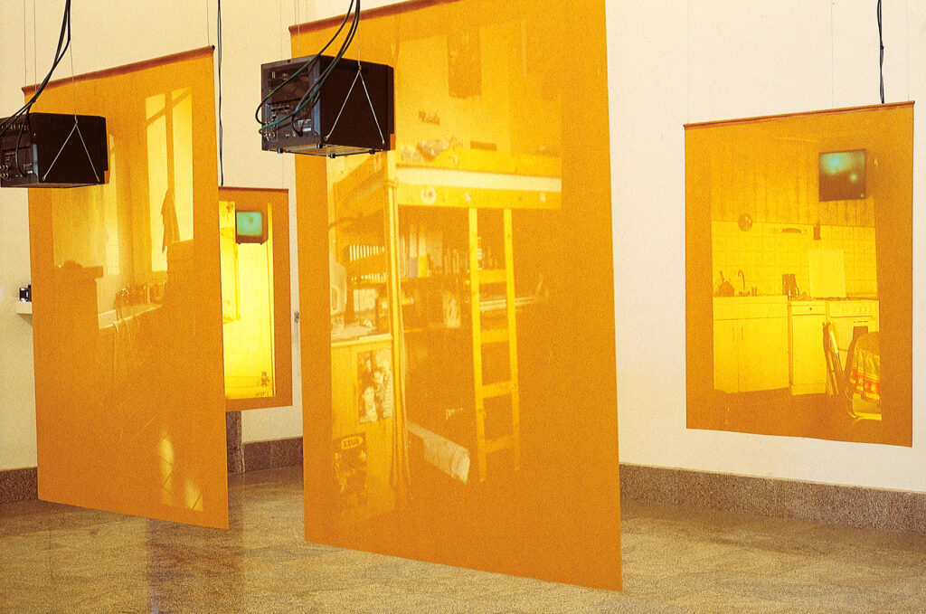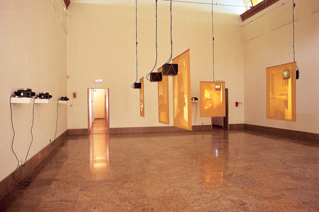 Projection, 1999Projections diapos, écran de latex, moniteurs de surveillance CIAP de Vassivière en Limousin Commissariat Dominique MarchèsProjection, 1999, projections diapos, écran de latex, moniteurs, CAC vassivière ©Bernard CaletProjection, 1999 (détail), projections diapos, écran de latex, moniteurs, CIAP Vassivière ©Bernard Calet