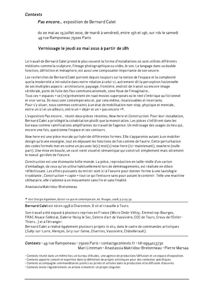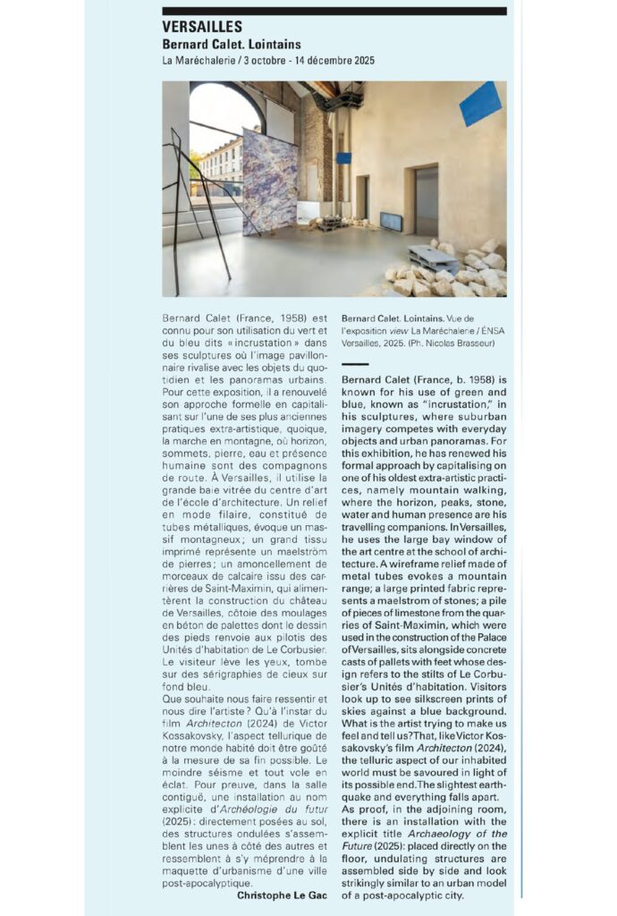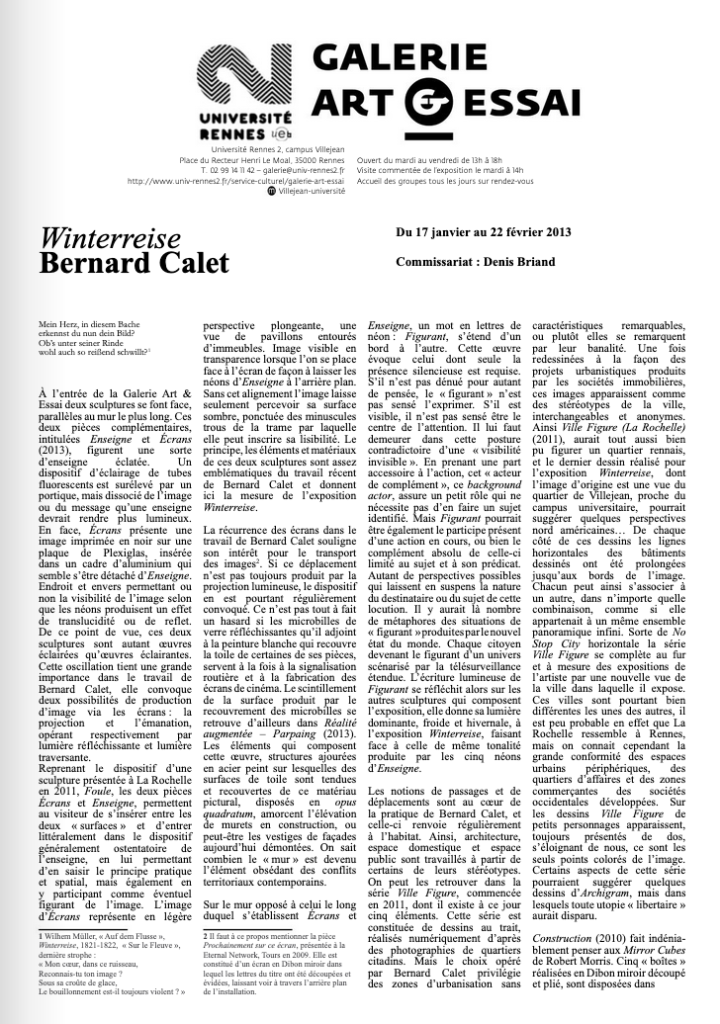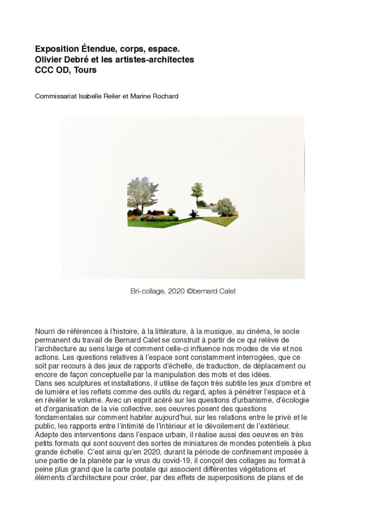 (…) Bernard Calet n’est pas architecte mais, depuis bientôt trente ans, il questionne les différentes échelles de l’espace construit, de l’urbanisme à la maison individuelle, en passant par la notion de paysage. Un simple clic sur le site DDA CVL permet de se rendre de compte à quel point l’architecture hante l’artiste. »(…)